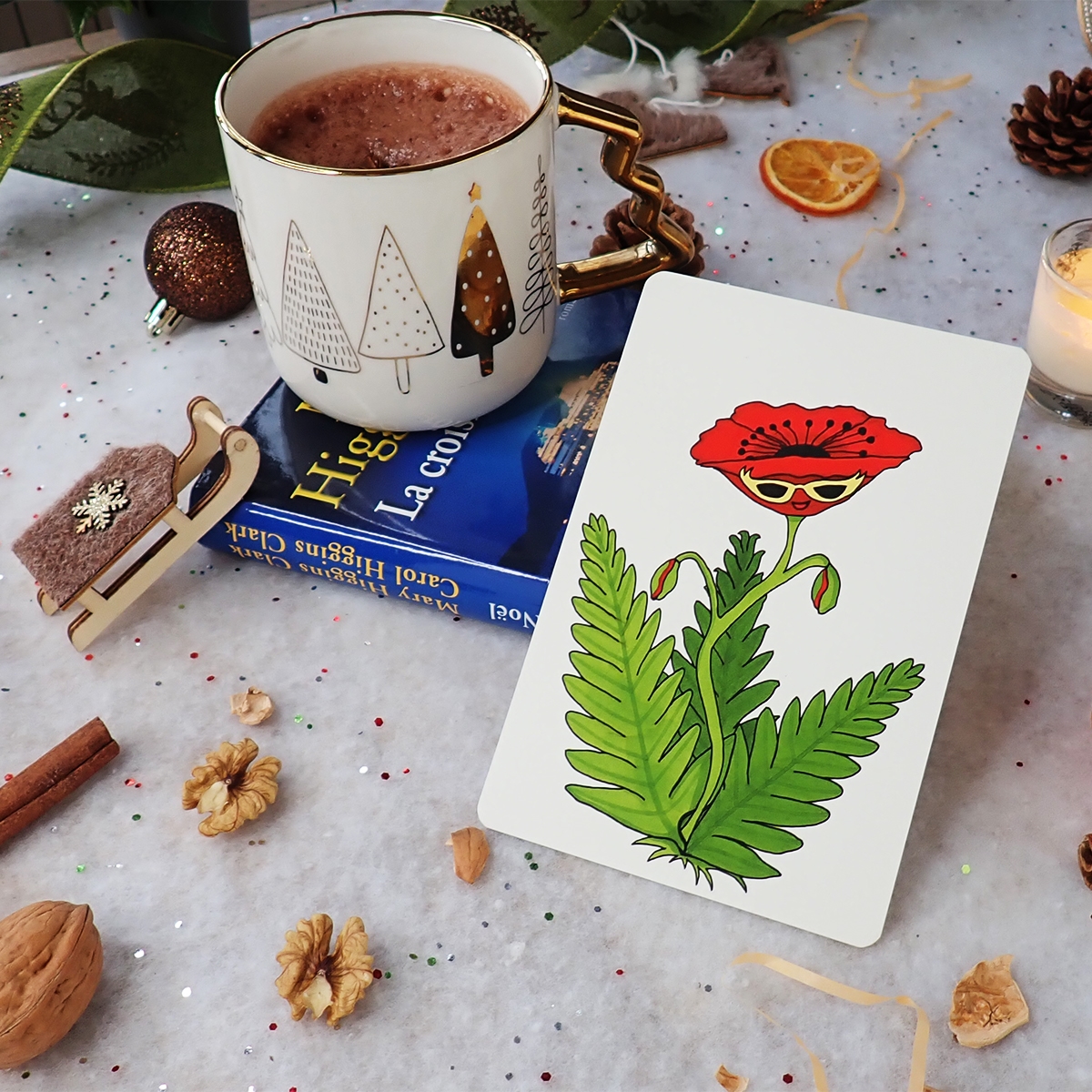 “Dame Pavot sous le soleil” met en scène un coquelicot profitant des premiers rayons, lunettes sur le nez.