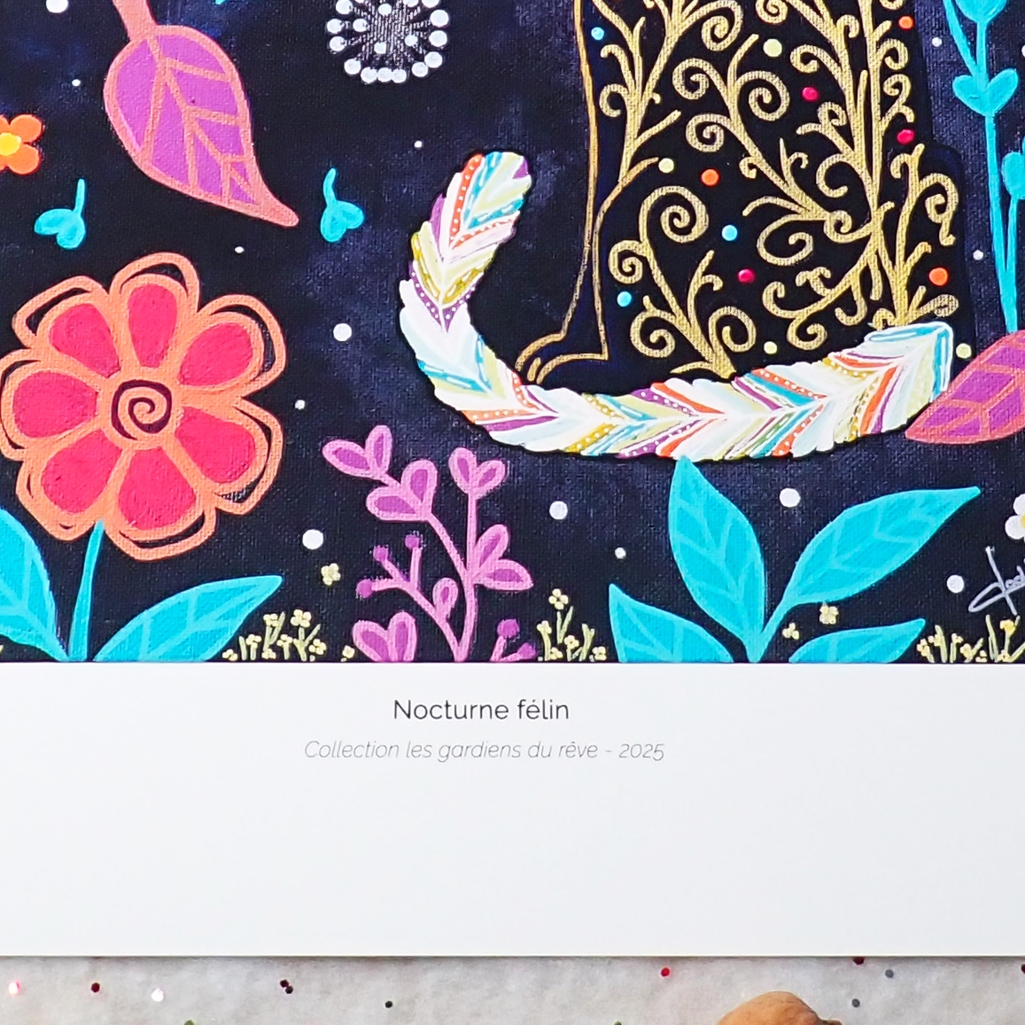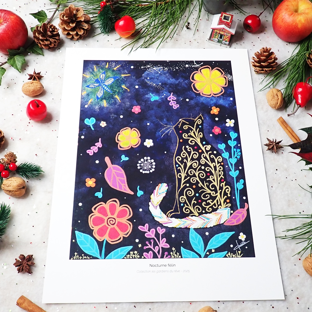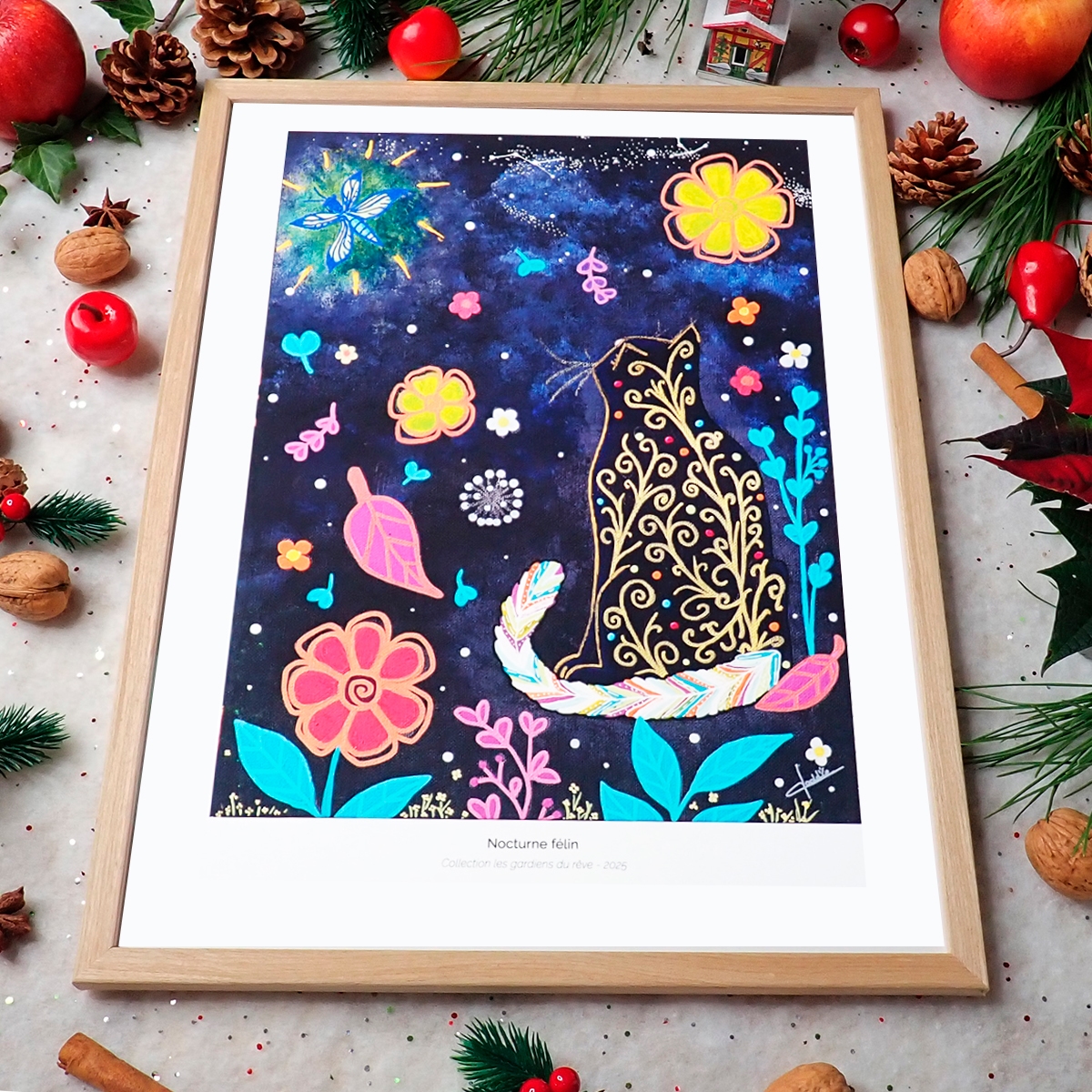 L’affiche Nocturne félin met en scène un chat stylisé baigné de motifs floraux et de lueurs nocturnes. Les teintes profondes et les détails poétiques créent une atmosphère apaisante et graphique, parfaite pour une déco de caractère.