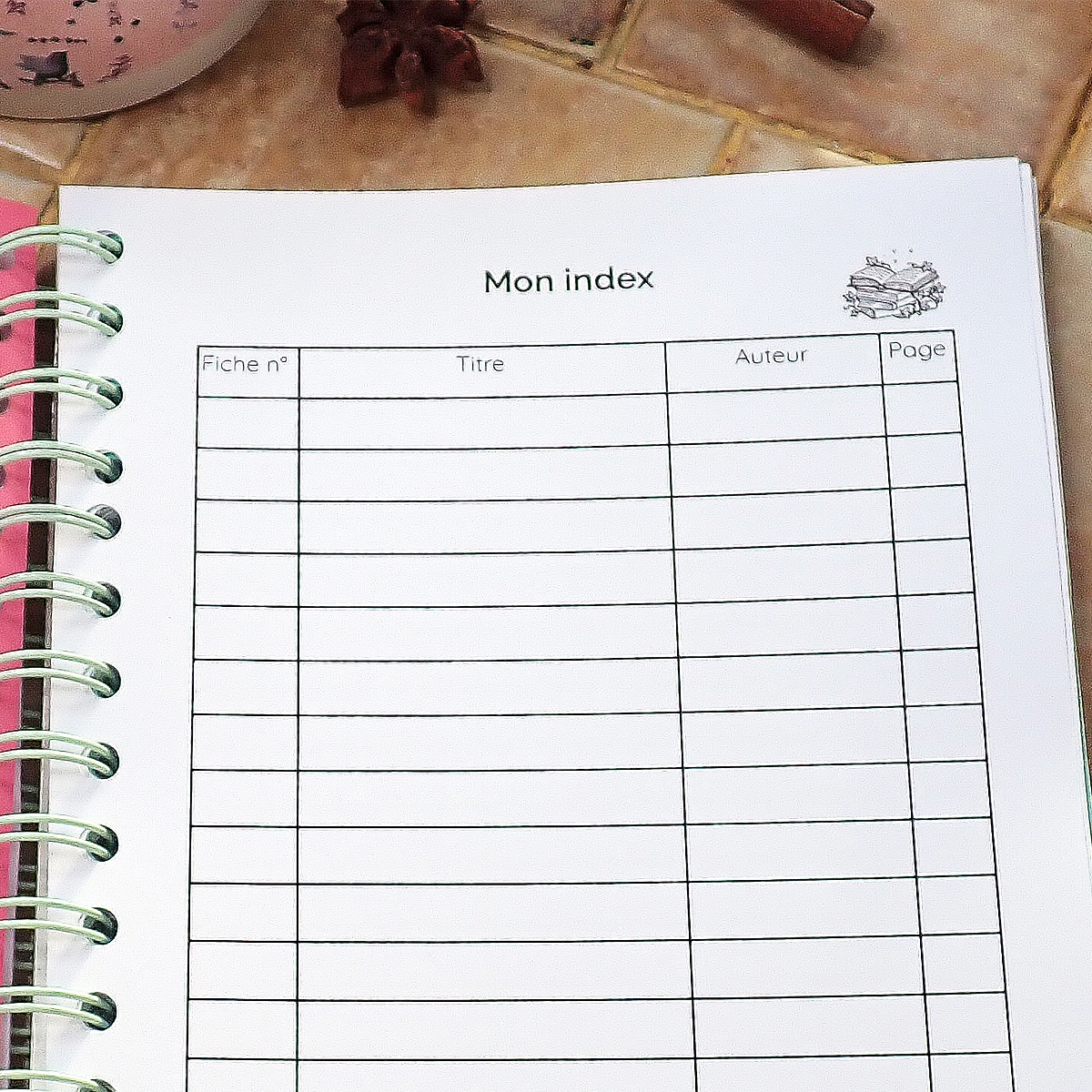 - un index pour noter les livres lu et retrouver rapidement la fiche de lecture ;