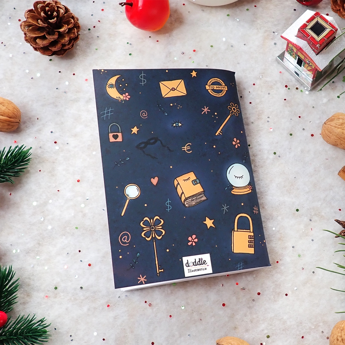 La couverture illustrée met en scène un univers nocturne et mystérieux : lune, clés, cadenas, livre, boule de cristal, enveloppe “Top secret” et petits symboles graphiques se détachent sur un fond sombre. L’ensemble évoque un carnet de secrets, à la fois ludique et élégant.