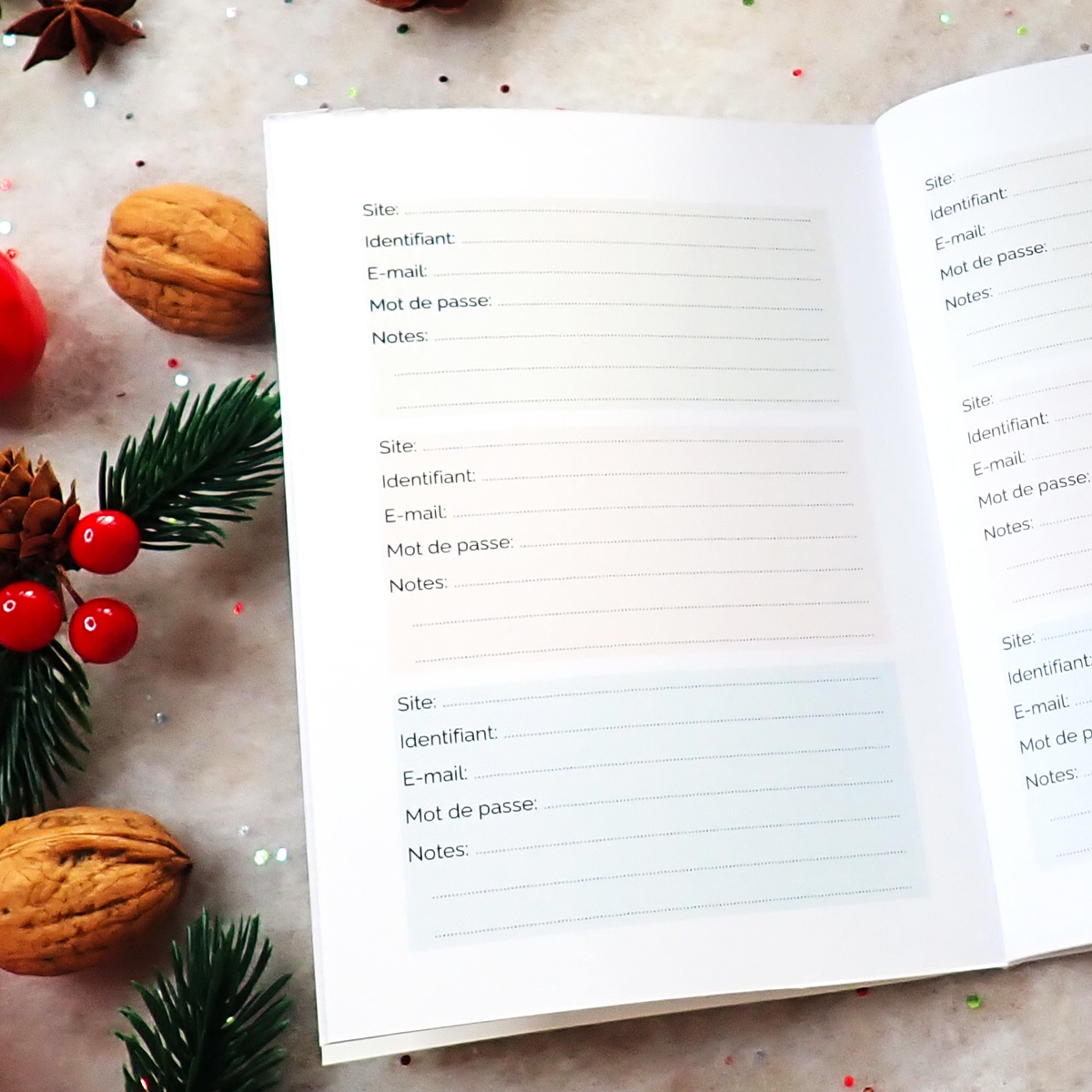 Le carnet “Mon pense-bête pour le net” allie esthétique et praticité, et devient un compagnon du quotidien pour organiser sereinement les informations numériques.
