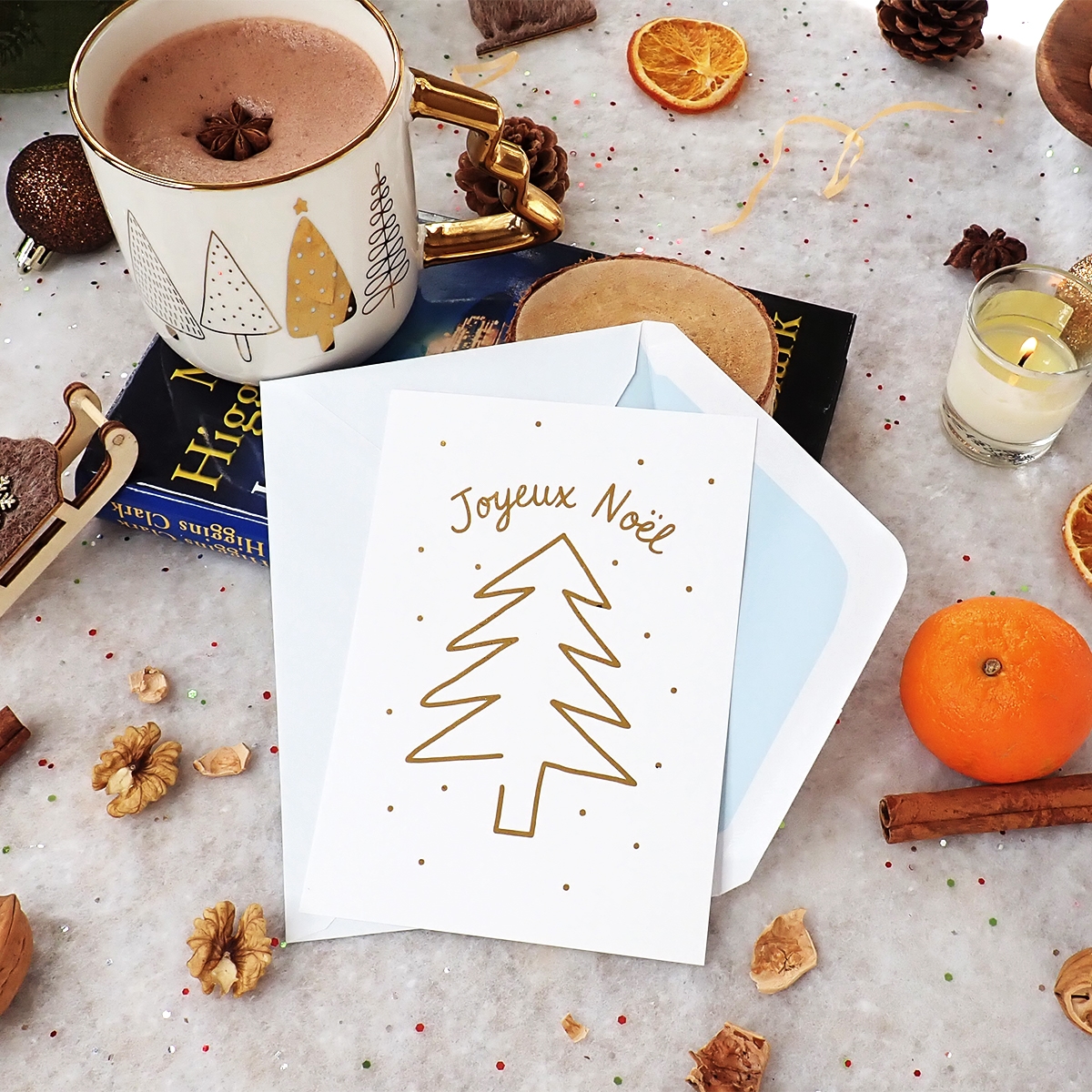 La carte A6 Joyeux Noël est imprimée sur papier premium 305 g/m² et ornée d’une illustration entièrement dorée au foil pour un rendu brillant et chic. Il s’agit d’un format simple feuillet (non plié) : recto doré illustré et verso vierge pour écrire votre message. Elle est livrée avec une enveloppe assortie pour un envoi soigné.