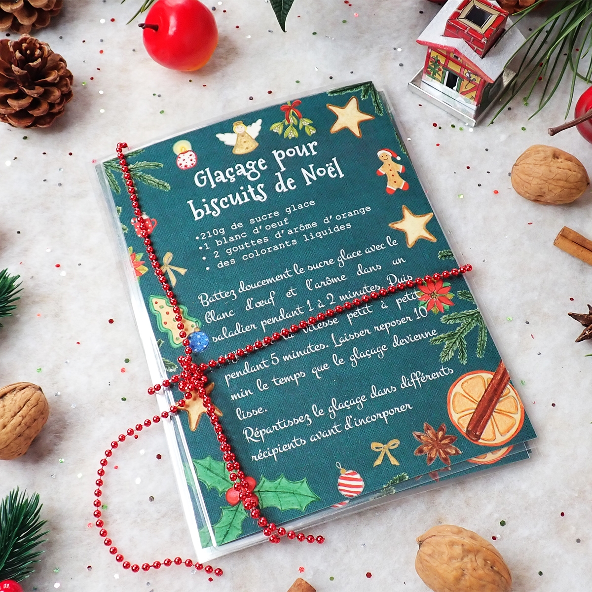Plongez dans la magie des fêtes avec cet ensemble de 7 cartes de recettes de Noël, conçues pour accompagner vos moments gourmands et festifs. Chaque carte est ornée d’illustrations évoquant l’esprit de Noël – sapins, anges, bougies, houx, et des ingrédients réconfortants comme la cannelle et l’orange, qui rappellent les saveurs et parfums de saison.